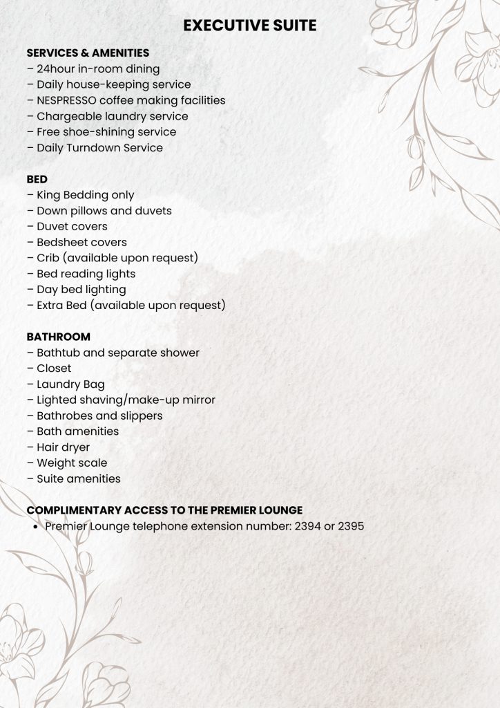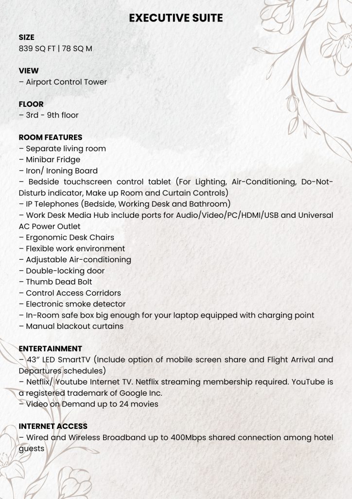Tastefully furnished inspired by the philosophy of home-living in a hotel, the non-smoking Executive King Suite offers spacious comfort and access to the Premier Lounge. For more information on our Premier Lounge, click here.