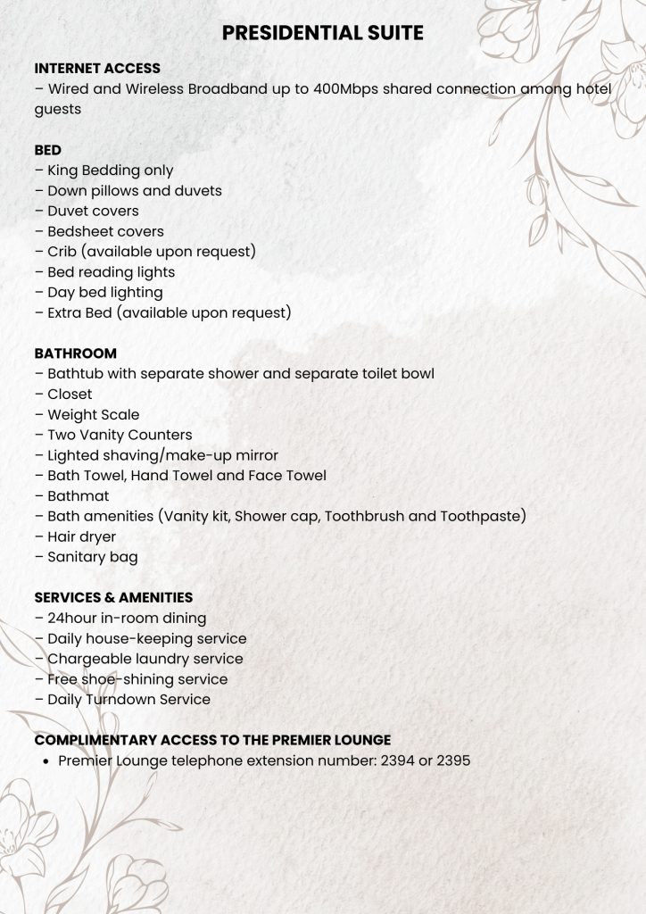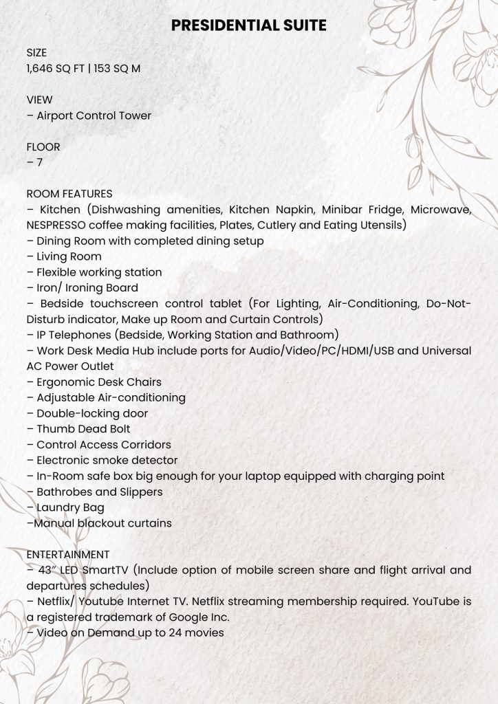 Elegant floor to ceiling of unparalleled luxury and opulence. Located on the 7th Floor, the non-smoking Presidential Suite accommodates a majestic array of facilities and features, including separate living room and dining room, pantry area and a direct exclusive access to the Premier Lounge. Sophisticated and refined, every aspect of the Presidential Suite is carefully crafted to create a sumptuous space fit for royalty. For more information on our Premier Lounge, click here.
